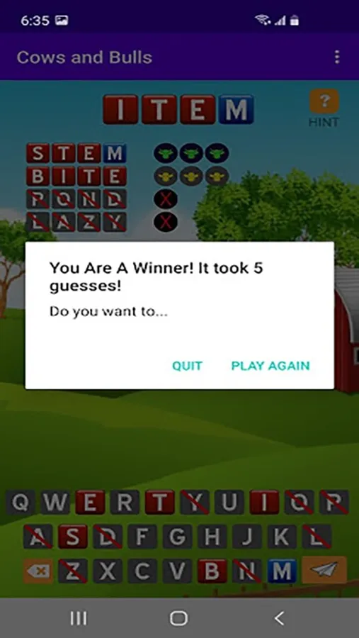 Allow the game to pick a word and challenge yourself to guess the word in as few attempts as possible. The game will let you know if your guess word has any right letters in the right positions (Bulls), right letters in the wrong positions (Cows), or invalid letters, and using the evaluation, you can strive to logically arrive at the right word.