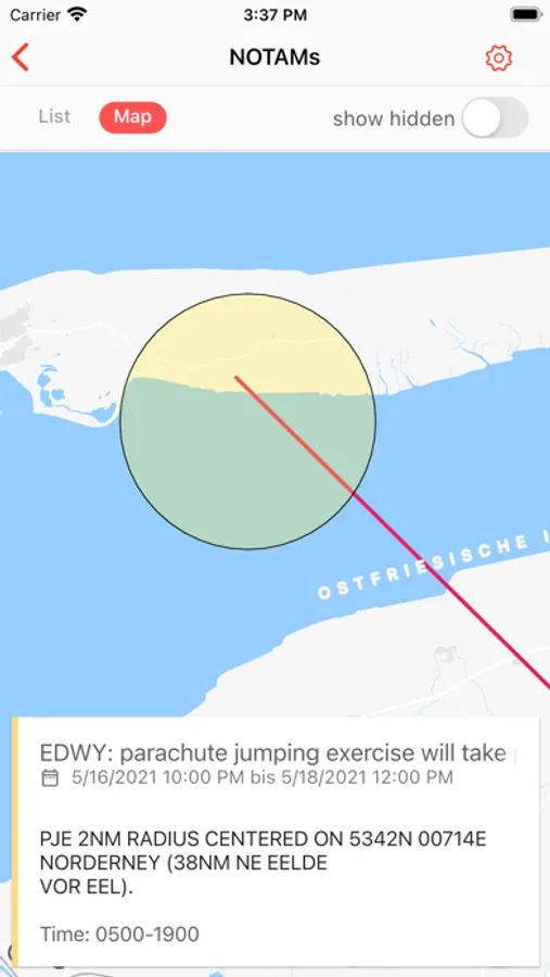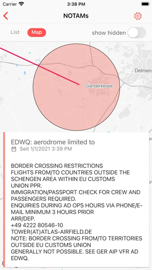 After entering the route, the relevant NOTAMs (notice to airmen) are displayed both as a list and on the map.