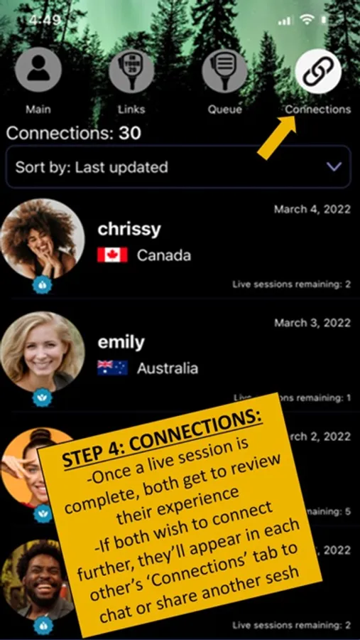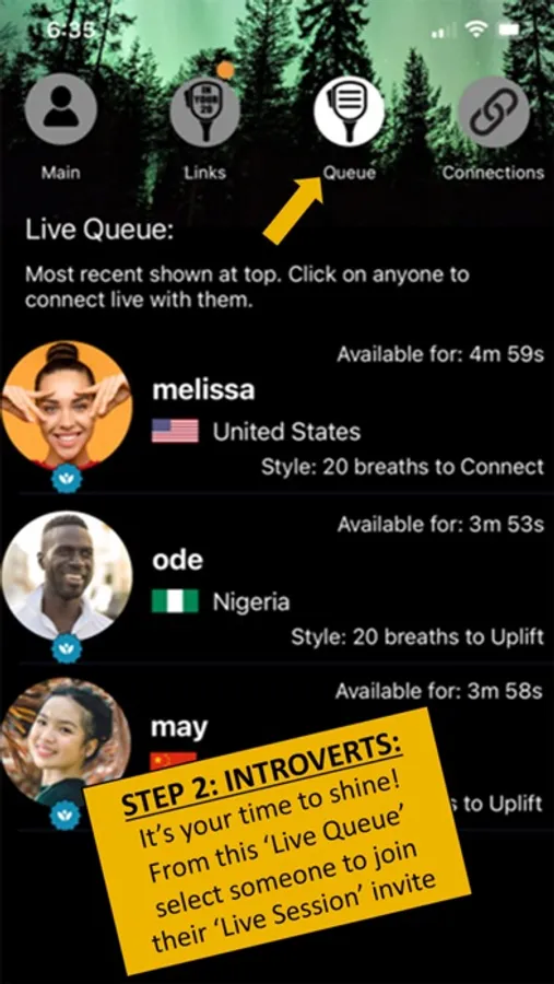 Have you struggled to find inner balance or create meaningful human connections during this unprecedented time? Look no further, you've found your tribe! IN YOUR 20 is the first true 'Connection App'. While experiencing a ‘Live Session’, you'll share 20 conscious breaths with another person, shifting your physiology from an acidotic state to an alkaline state, energizing your body, bringing your mind into the present moment; While safely holding space for one another, creating meaningful human connections throughout the world. If you both wish to connect further after the shared ‘Live Session’, they will appear in your ‘Connections’ tab where you can chat with them.