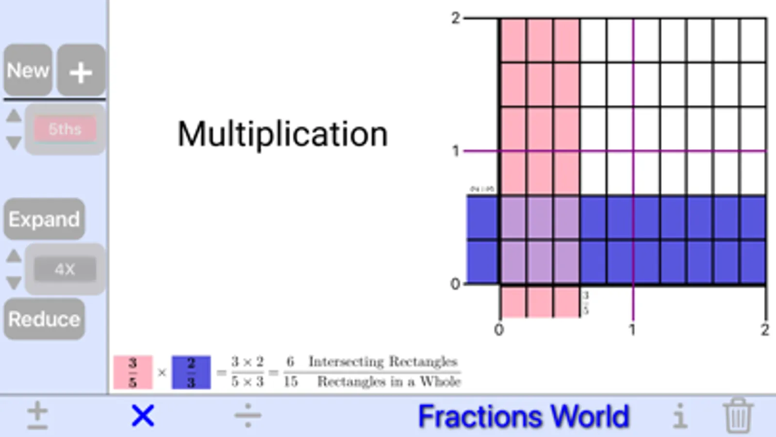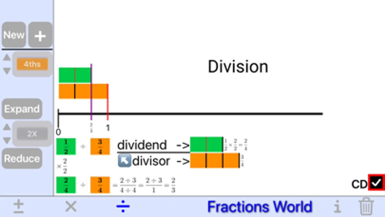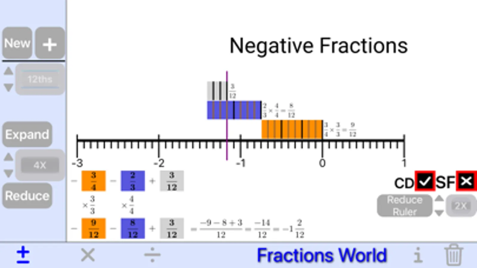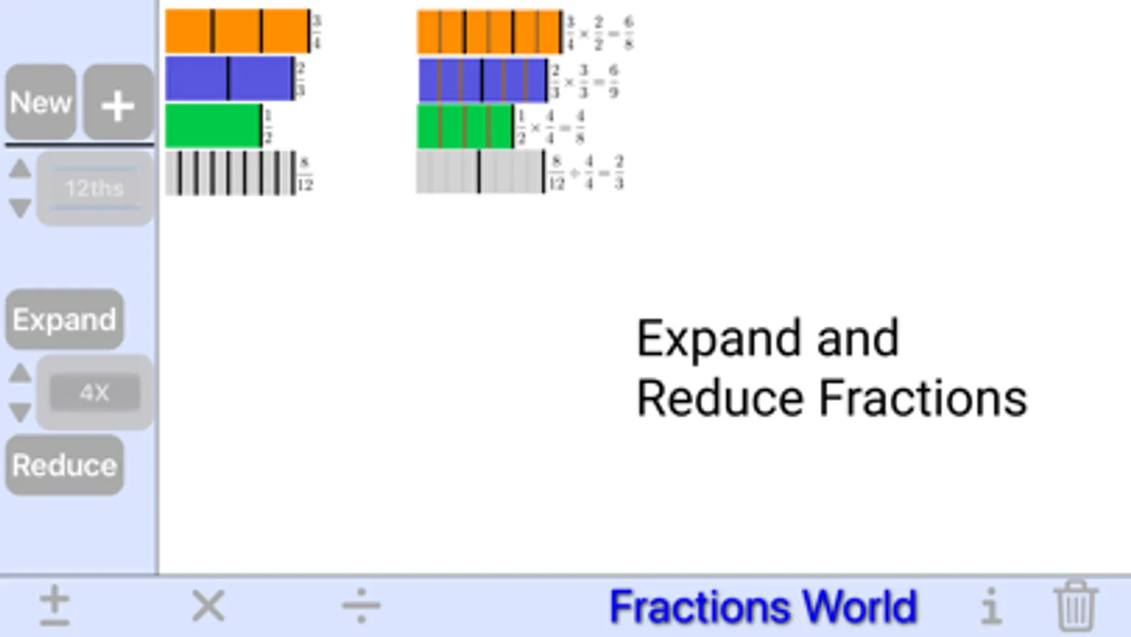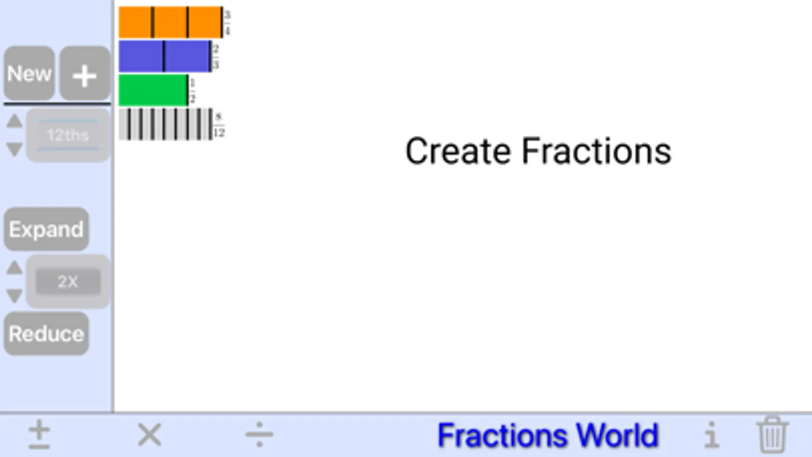 This app is a fraction bar virtual manipulative that combines the visual representation of fractions along with the mathematical symbols students are taught to manipulate in class. It's a great way for students to get a deeper understanding of what fractions are and what the basic operations on them mean. Create fractions. Expand and reduce them. Add subtract multiply and divide fractions.