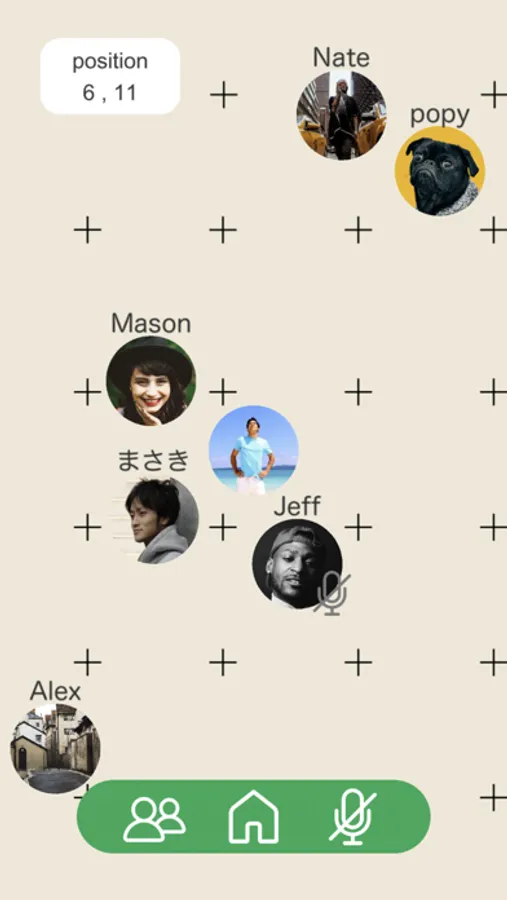 ChillTalkでは1つのルームに全てのユーザーがいます。自分のアイコンを操作することでルーム中を自由に移動できます。また、他ユーザーとの距離によって音量が変化するので興味のある会話に自由に参加できます。