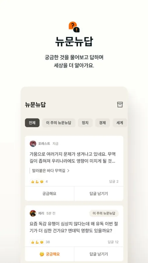 - 궁금하긴 한데 누구한테 물어봐야 할지 몰랐던 궁금증, 이제 뉴문뉴답에서 뉴니커끼리 묻고 답할 수 있어요.