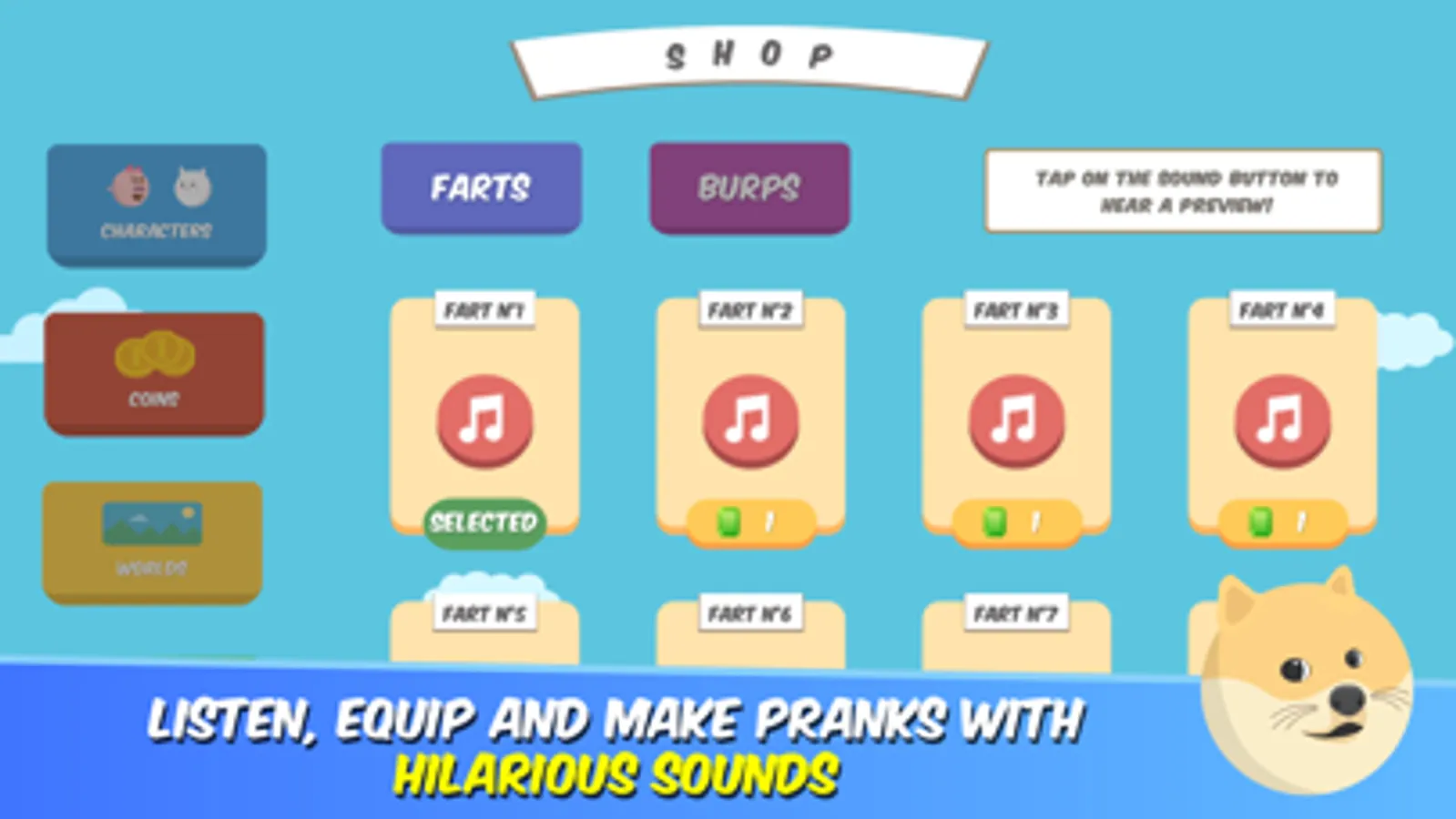 - A lot of fart sounds available to equip or make fart pranks!