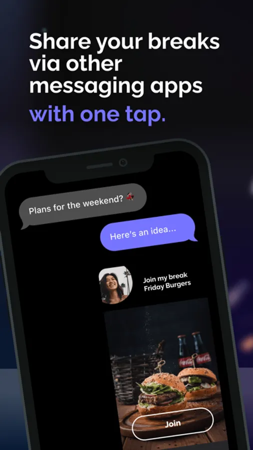 - Break is about the event happening, and it’s easy to share the event with friends through any method. Just message them a link to the break you just created.