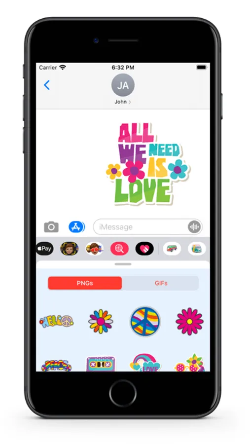 Open any message you have and at the bottom of the screen, you will see the buttons of your app list out. If you see this app, please tap on it and the stickers collection will show up, if not, please slide to the left to find this app.