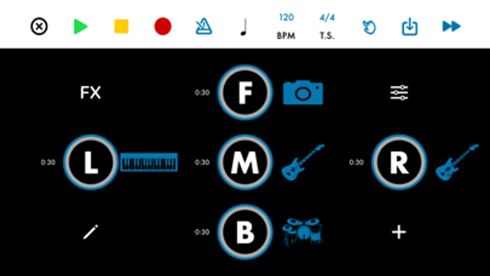 To create a 360 song, you can simply record using your device microphone (for the best results, put your headphones on when you are recording), upload your own tracks from Files, and record with our build-in drums and piano. You can add reverb and delay effects, mix the tracks' volume and swap between the position tracks.