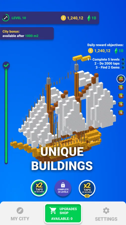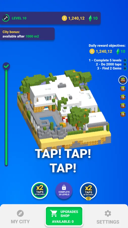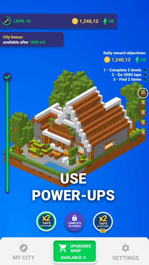 Blocks Building Clicker has a game shop, where you can buy some upgrades for your block. For example in the beginning all your blocks have 1 level, it means that when you tap only 1 block will be spawned, but if you upgrade some block to 2 levels, one tap will spawn 2 blocks.