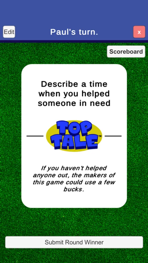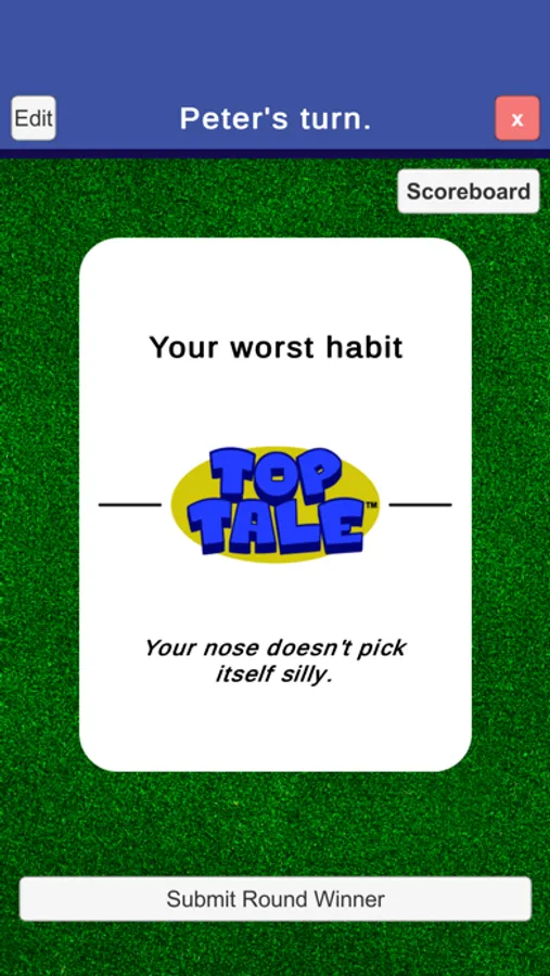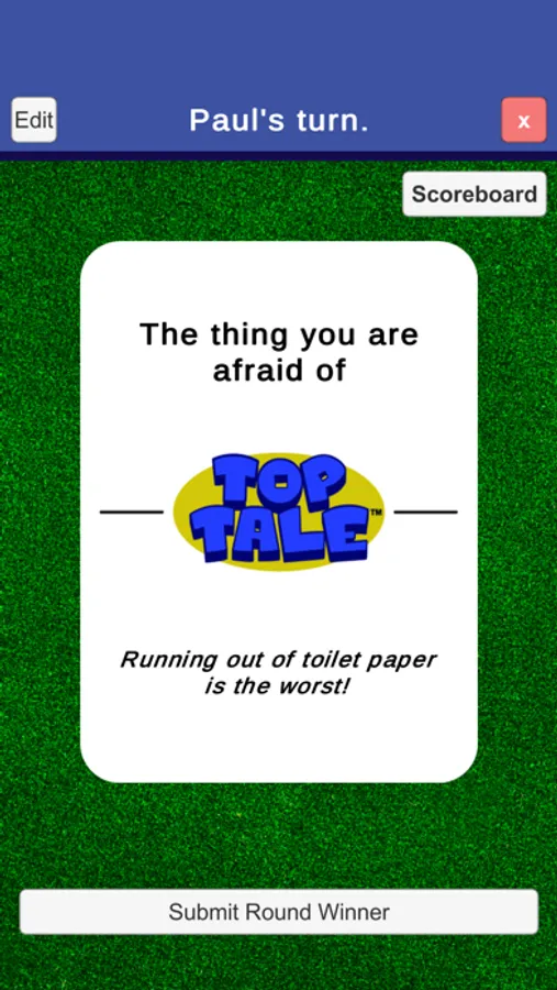 Top Tale is a casual party game that takes the process of getting to know your fellow human and makes it a fun, often insightful, experience. The game is played by sharing tales in response to cards topics then voting on the Top Tale!