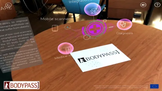 Explore the characteristics and main features behind the BodyPass project through augmented reality on your mobile device. The BodyPass app allows you to easily explore all of the different features of the project in an augmented reality setting. You will be able to move through different scenarios while interacting with the multiple nodes, which will immerse you in a fun and educational experience while learning about the BodyPass project, its uses and benefits. Furthermore, with the BodyPass app you will know more about the cloud platform used in the process and the numerous metrics that play a big part in the mechanics of the project. All of this comes in an environment that uses augmented reality technology and a wide variety of 3D models which will make sure that you have an entertaining and pleasing experience while learning about the BodyPass project. This project has received funding from the European Union’s Horizon 2020 research and innovation programme under grant agreement No 779780.