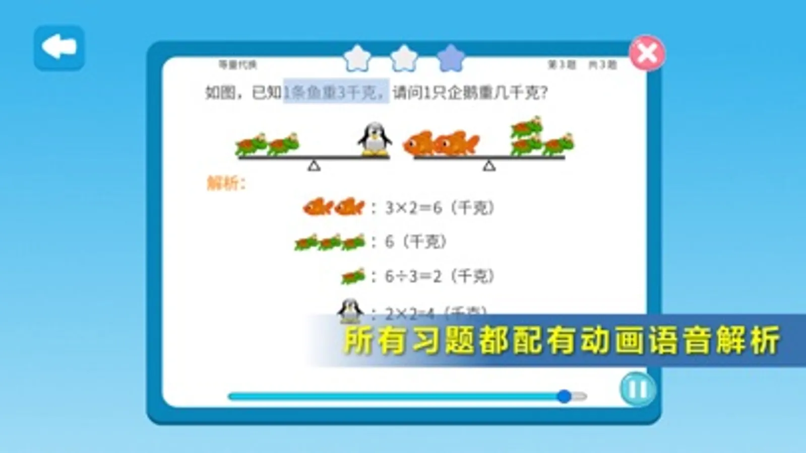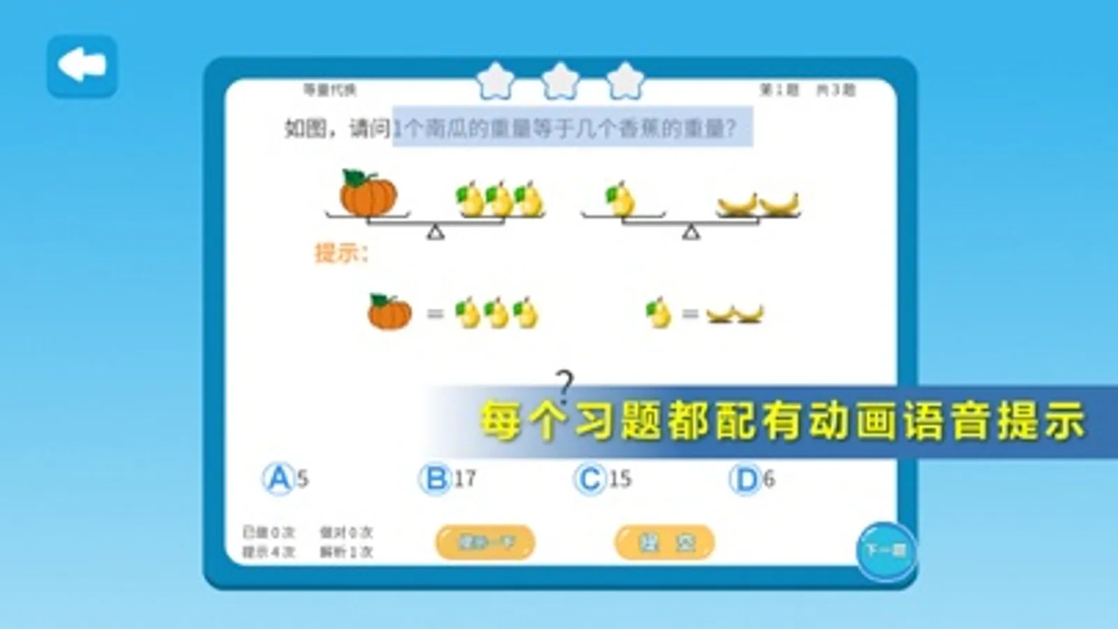 为了达到这个目的,APP里每一个练习题,都配有动画语音提示,在孩子不会做的时候,不急着去直接给出答案,而是先给点提示,以此来启发孩子的数学思维,帮助孩子养成热爱思考的习惯。提交答案以后,系统会自动批改,然后给出详细的动画语音解析和完整的正确答案。每次练习的题目,都是根据孩子以前做题的情况,由程序智能选出。没做过的,不会做的或者是做错的,将会优先推送给孩子。并且,每次题目的答案都会随机变化,以方便孩子反复练习。