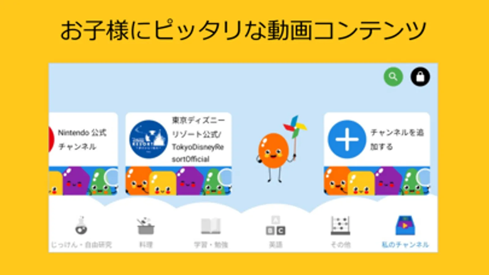アプリにあらかじめ登録されているお子様向けの動画チャンネルに加えて、お子様が見たい動画チャンネルを検索し追加することができます。