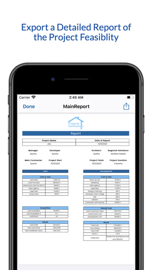 The application provides an amazing report that shows the assumptions, plus the results of app calculations, which help the user to give him an idea of residential Feasibility.