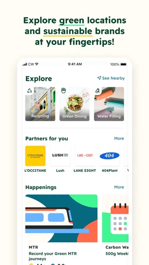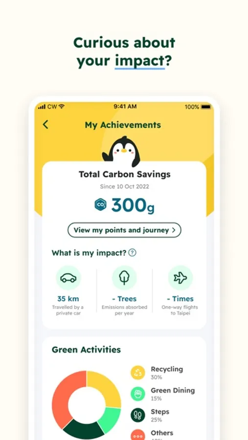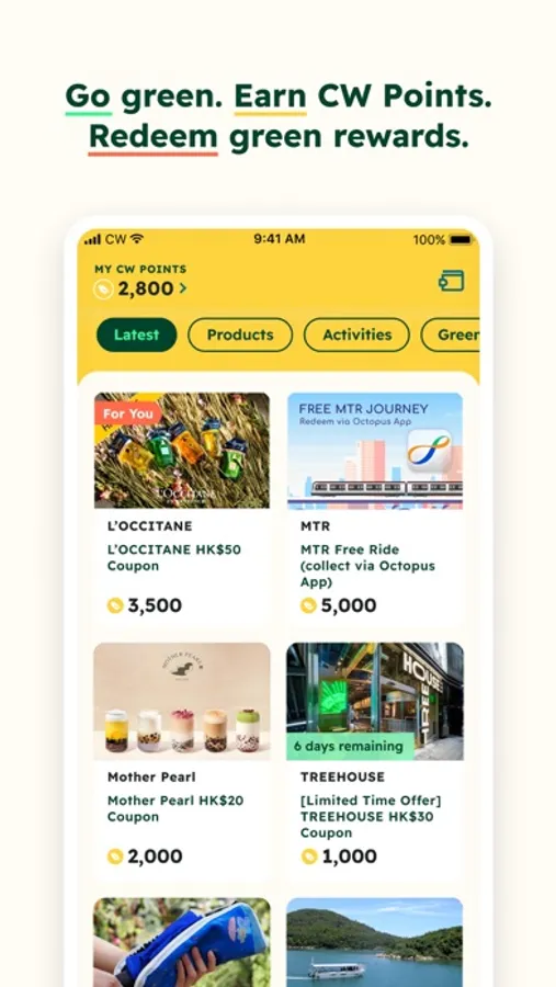 Users can earn CW Points by practising green actions, which can be used to redeem green products, services, experiences from sustainable businesses and organizations.