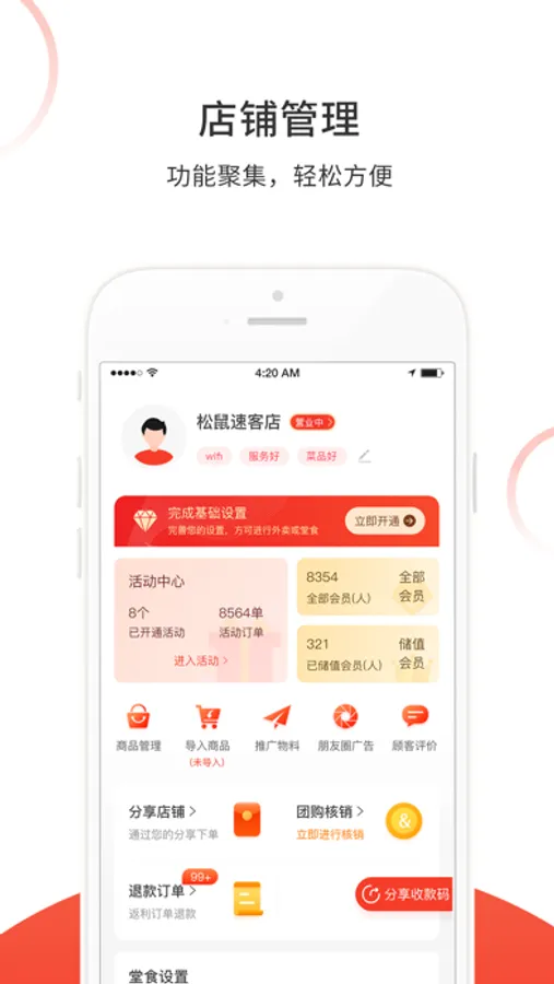 松鼠速客是一款关于商户管理用户自运营的软件,主要功能是能够接收并处理客户的订单信息,线上对账,以及管理各类线下开展活动等。