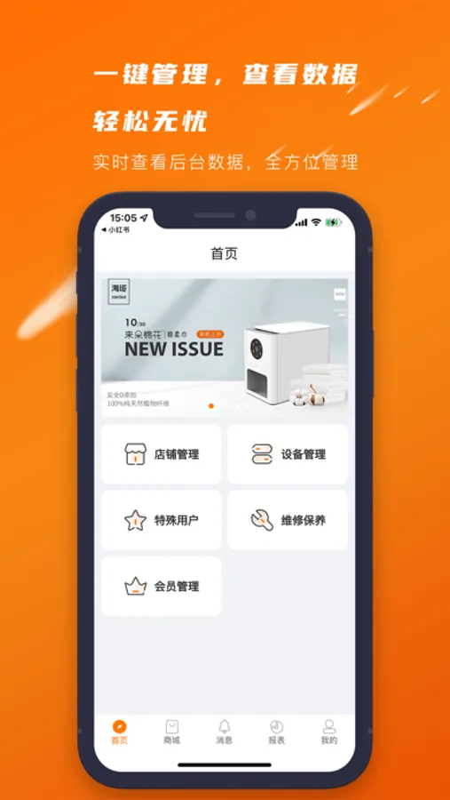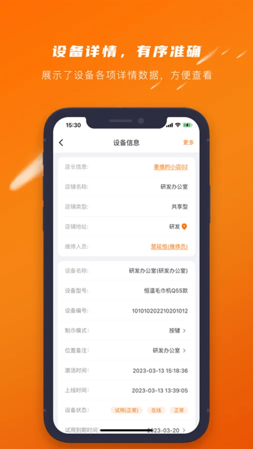 自动获取名下所有终端设备(湿巾机)工作信息和收益情况,通过手机APP实现对商芯湿巾机的远程监测和控制。