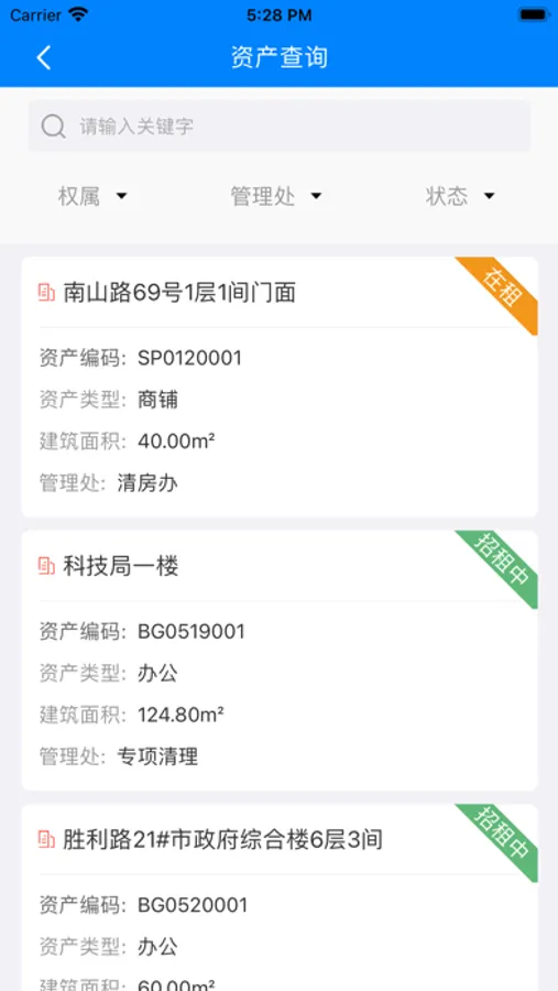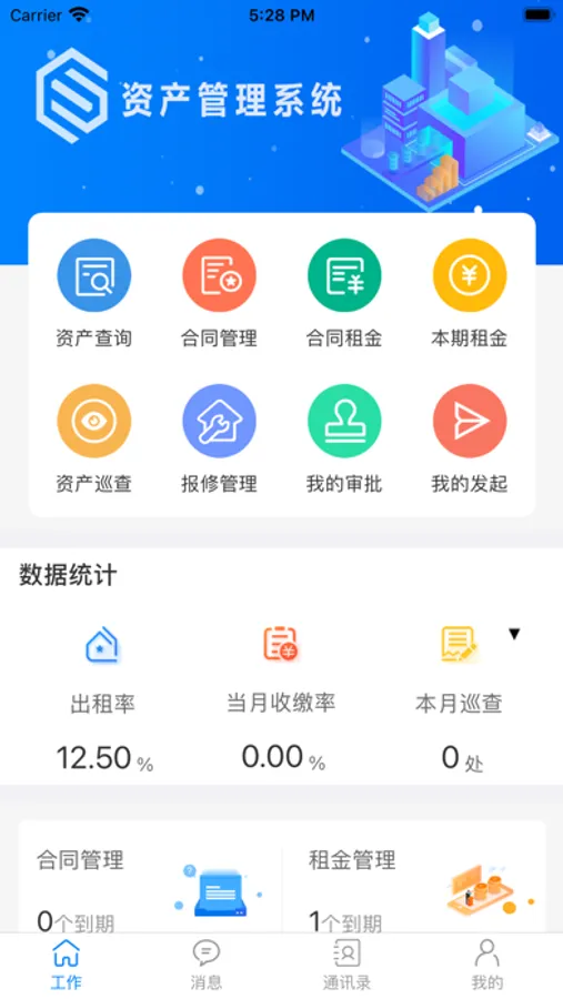 主要功能包含资产信息查询、合同查看、租金登记、安全巡查、在线报修、审批管理、通知消息等功能,为房产租赁人员提供便利