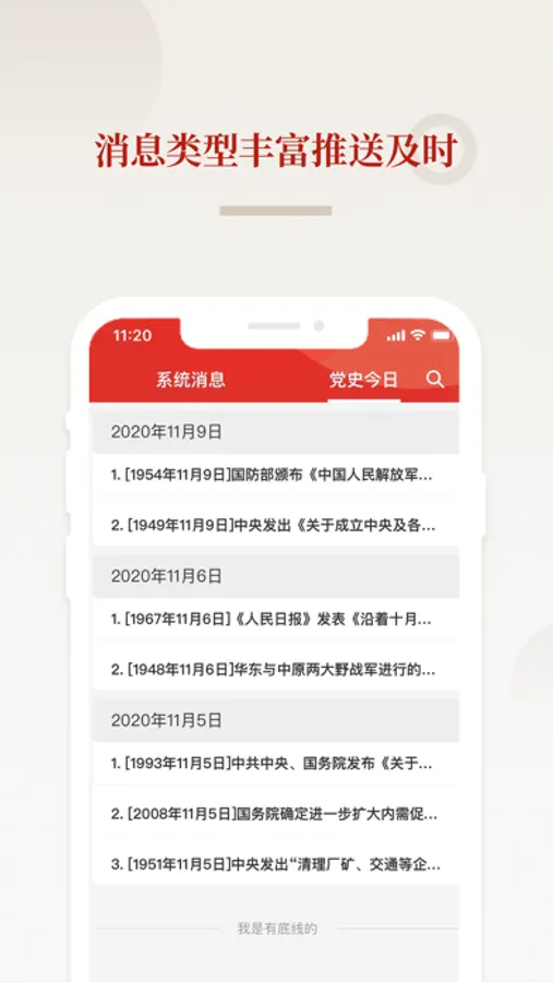 1消息系统:包含软件内通知公告以及党史今日的定时推送;