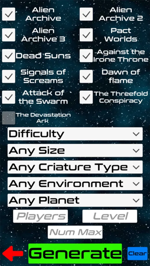 With this tool you can create fights more comfortably and quickly. Includes over 500 aliens from all books and expansions. The results show a possible configuration that can be modified by the user to obtain a better adaptation.
