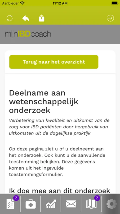 Gegevens uit mijn MijnIBDcoach kunnen gebruikt worden voor wetenschappelijk onderzoek naar uw ziekte. Hierover wordt u volledig geïnformeerd. Dit toestaan is vrijwillig. Of u wel of niet toestaat verandert niets aan uw behandeling of aan de relatie met uw zorgverlener.