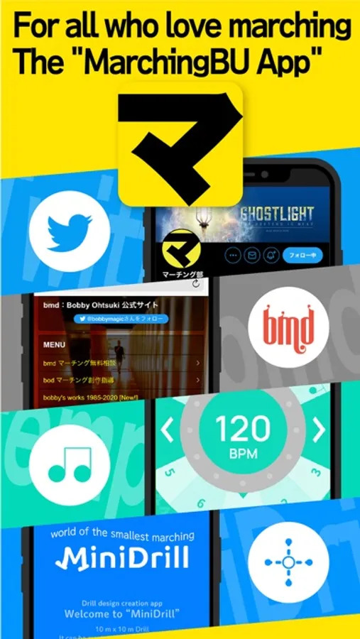 "MarchingBU app" that combines "information", "community", "metronome", and "drill design"