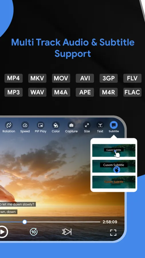 Video Player supports all video formats, including 4k, HD, MKV, AVI, MOV, MP4, 3GP, and MPEG, as well as all music and audio file formats.