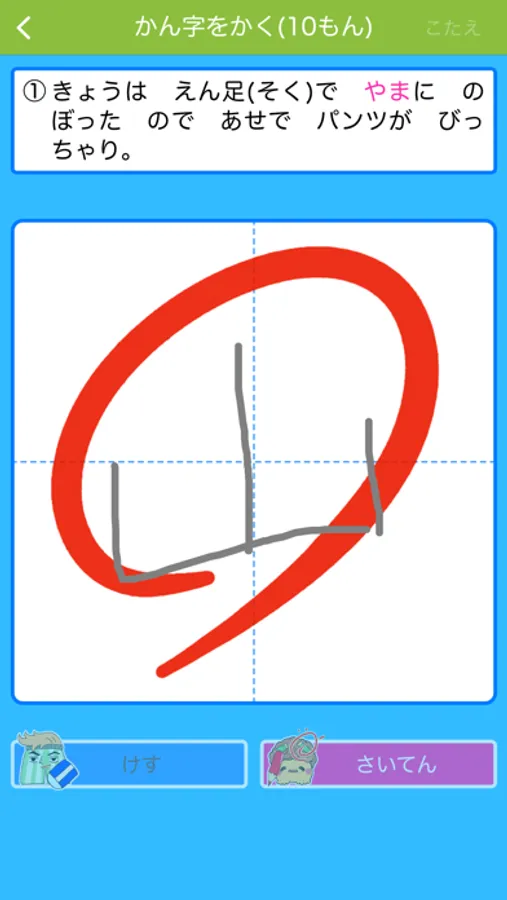 ・不正解の漢字は、なぞり書きで書き取り練習ができます。