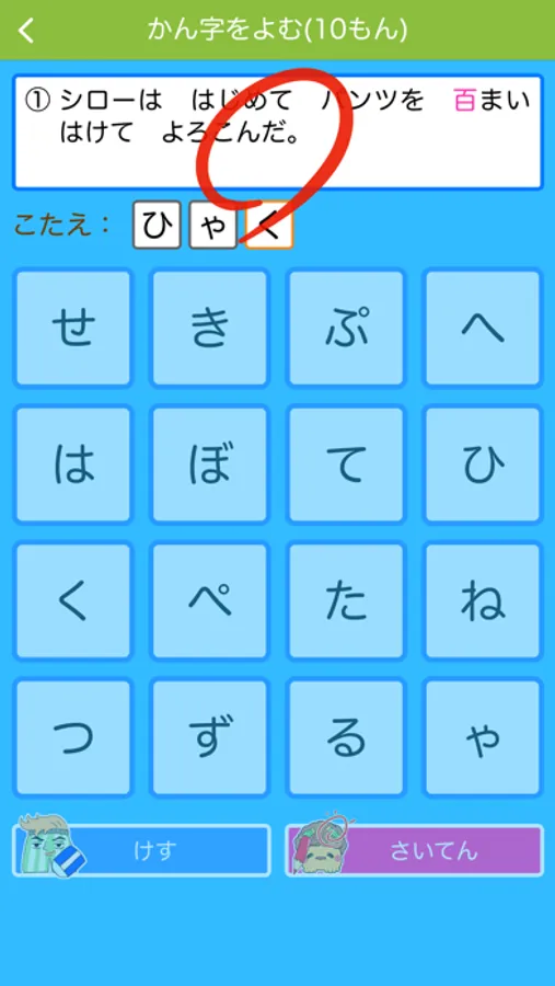 ・「かん字をよむ」では回答の文字を含む16この回答候補の中から正解を選択して下さい。