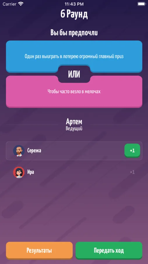 Сам игровой процесс прост до неприличия: вы вводите всех имена игроков, выбираете наборы в которые хотите играть, а дальше ведущий (каждый раунд игра выбирает нового) нажимает на кнопку "Следующий вопрос" и озвучивает то, что ему выпало, не делая выбора в пользу одной или второй альтернативы. Затем все остальные участники игры по очереди объявляют, что бы они выбрали из двух предложенных вариантов (какими бы непривлекательными или, наоборот, равносильно приятными, они ни казались, выбор сделать придется) и аргументируют, почему. Ну а после того, как все, кроме ведущего, высказались, начинается безжалостная и неукротимая бойня, которая может затянуться надолго ;)