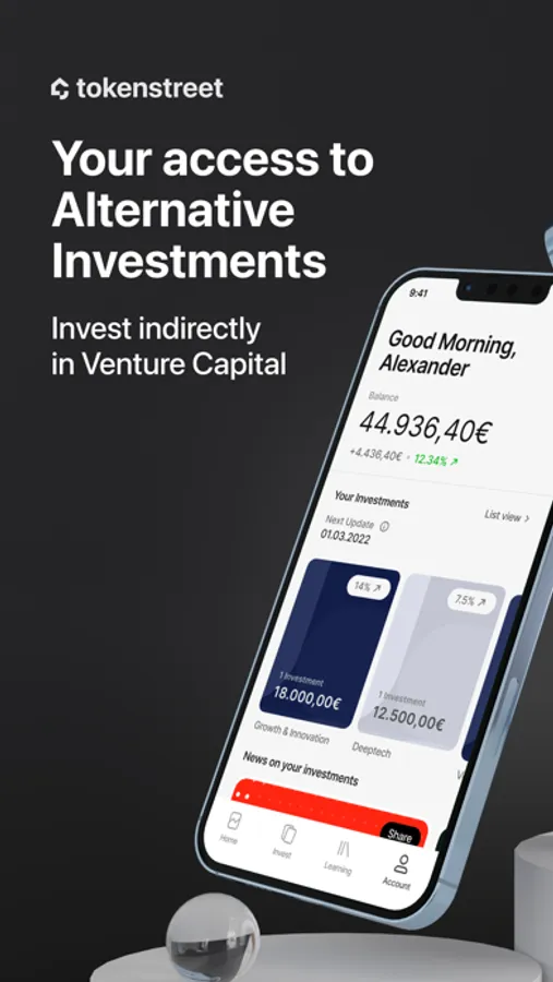 tokenstreet is your access to indirect investments in venture capital and private equity - digital, understandable and starting at 100€. Invest in a digital security through our app and diversify your portfolio with an attractive complement to the traditional stock market.