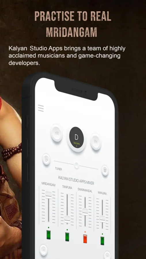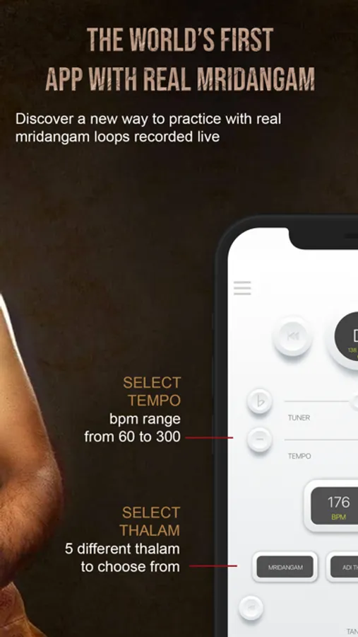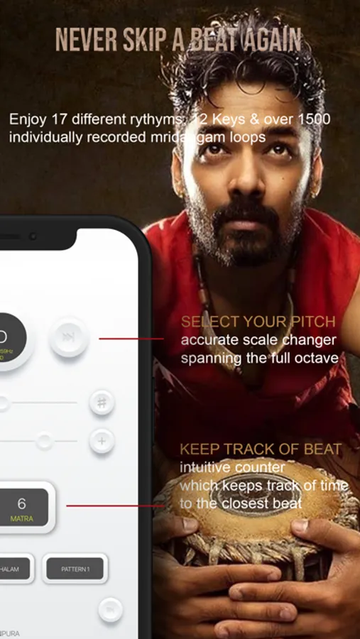 Whether you are a singer, musician or Carnatic instrumentalist (such as a harmonium, violin, veena, mandolin or flute player), you can play the loops and rhythmic beats of the Mridangam drum provided as accompaniment when you practice.