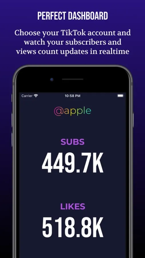 Add as many TikTok accounts to the dashboard as you want, select an account, put you phone on a table and watch your TikTok subscribers and likes grow. TikCounter is easy and beautiful way to track TikTok metrics and see your TikTok dashboard without any distractions.