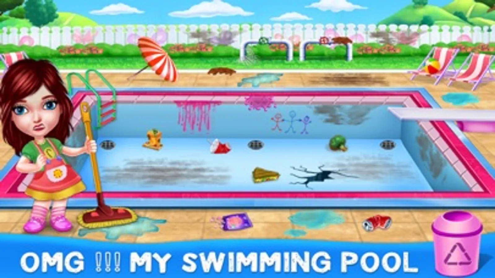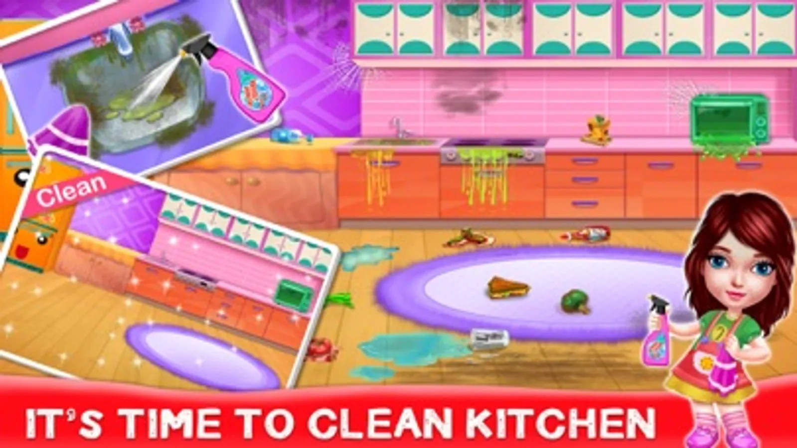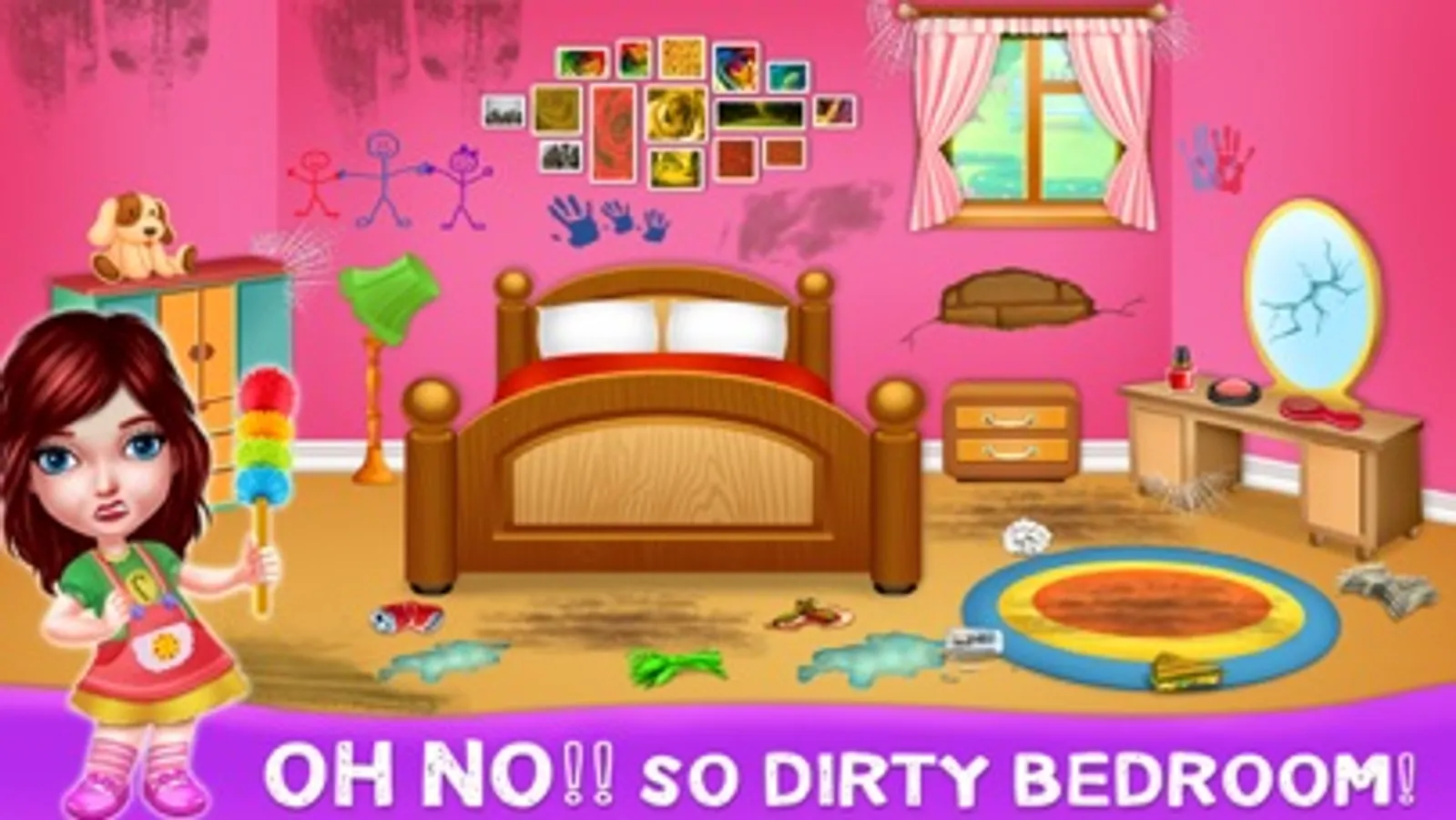 Clean dirty house using broom, brush, mop, paint cleaner, spider dust, vacuum cleaner, wall cleaner spray.