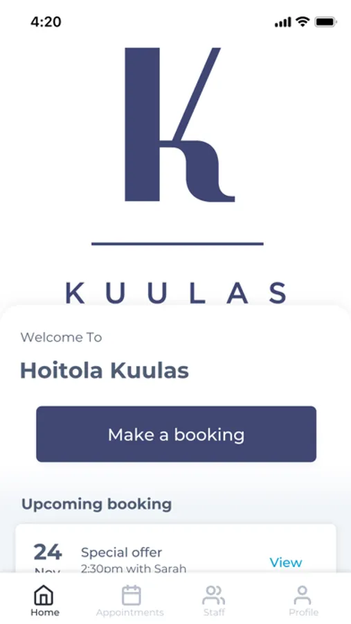 The Hoitola Kuulas app makes booking your appointments and managing your loyalty points even easier. You're just a few taps away from feeling good and looking great!
