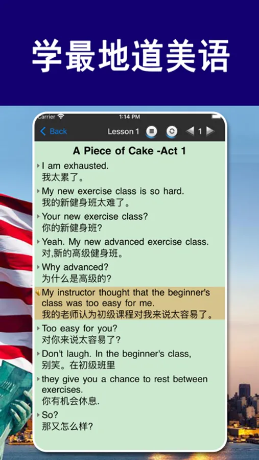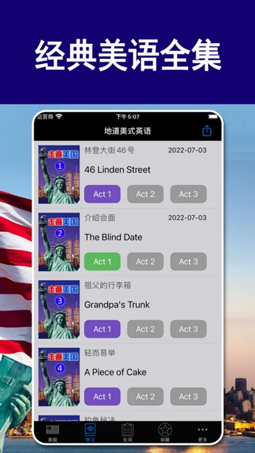走遍美国全文定位点读,同步高亮显示,长按任意单词即弹出词典,可加入生词表。