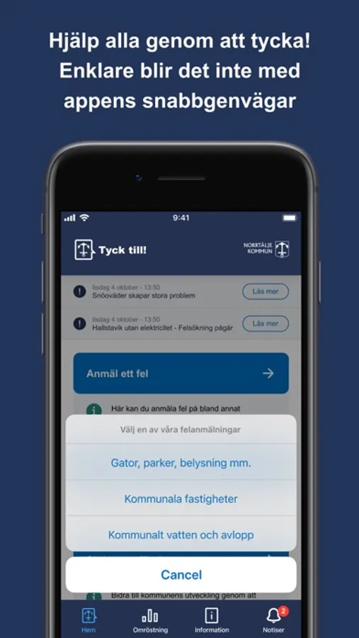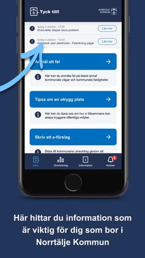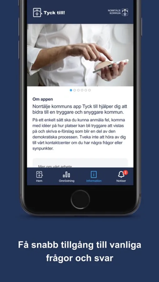 Det har aldrig varit enklare att anmäla fel och bidra till tryggare gator och torg i Norrtälje kommun. E-förslagen har fått en framträdande plats för att öka delaktigheten. Appen har en avskalad design för att du snabbt ska kunna utföra ditt ärende och ta del av Norrtälje kommuns e-tjänster.