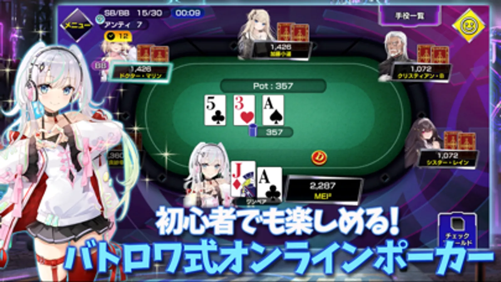 また登場する個性豊かで魅力的なキャラクター達は、ポーカーをプレイすることで好感度を上げることができ、一定の好感度をこえると“進化“を遂げ姿が変化したりその他、ゲーム内で使用できる新たなキャラクターボイスやスタンプが解放されていきます。