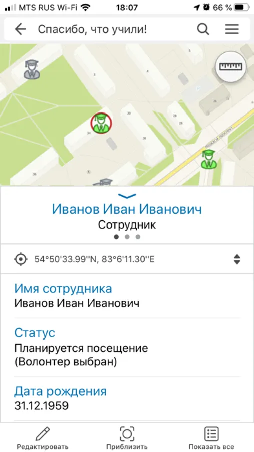 В рамках акции "Спасибо, что учили!" вручаются новогодние подарки пожилым преподавателям НГУ. Помимо подарков, приложение помогает в организации систематической поддержки пожилых преподавателей. Приложение содержит карту с указанием места жительства преподавателей (с точностью до дома).