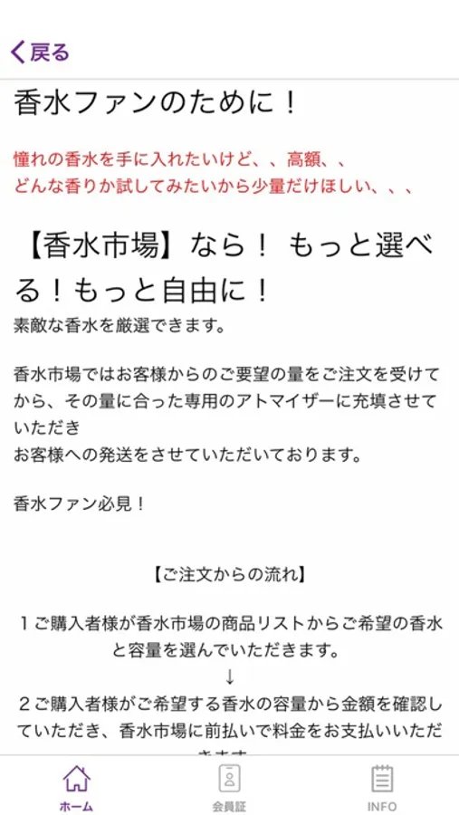 あなたのお気に入りの香水を便利なサイズでお届けする【香水市場】へ簡単にアクセスできます。その他、新着情報やクーポンなどのお得な情報をいち早く、スマホのポップアップ表示にお知らせ!アプリからお気に入りの香水へダイレクトにお買い物画面へアクセスできる便利なツール!