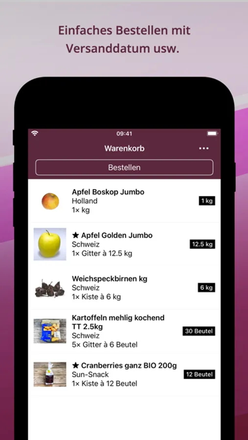 Mit unserer App können Sie rund um die Uhr und von überall, bequem und unkompliziert Ihre Bestellungen tätigen. In unserem App- Shop finden Sie unser gesamtes Sortiment, bestehend aus über 5’000 Artikeln in höchster Qualität. Erstellen Sie ganz individuell eine Einkaufsliste und mit einem einfachen Klick landet das gewünschte Produkt direkt in Ihrem Warenkorb.