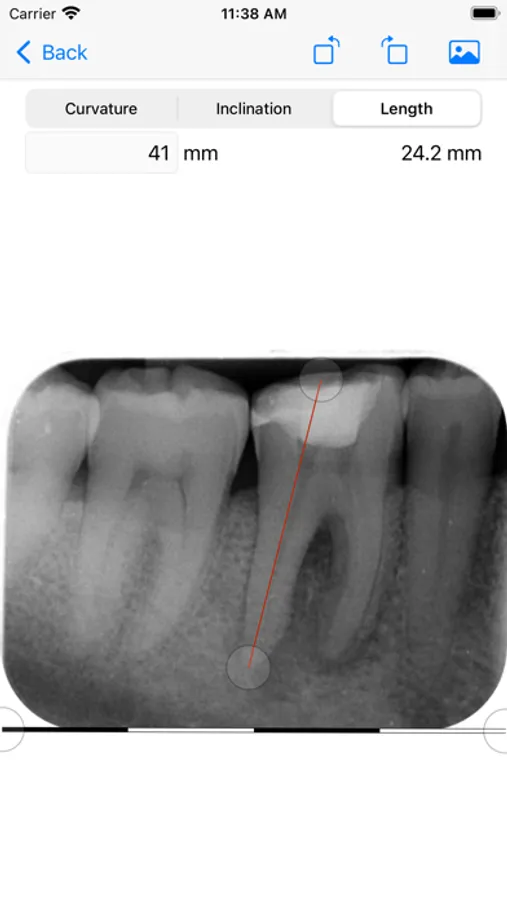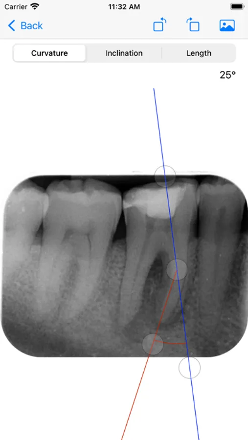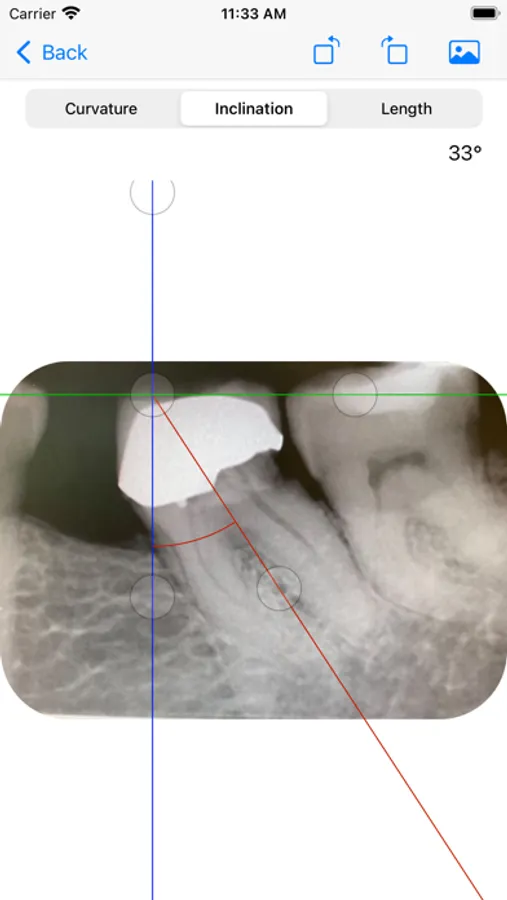 The application contains a feature where you can upload images and measure angles and lengths on the image. The measurement tool is useful when you are discussing cases with your colleagues when you do not have radiographic software available. You can also use your camera to upload and measure images. The measurement tool is useful if you use chemically developed films and hence do not have digital software to measure radiographs.