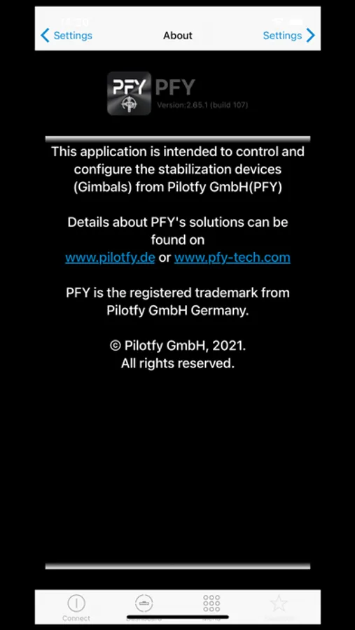 This is the official App for the Pilotfly (PFY) stabilizers. PFY - Gimbal RC App works through WiFi which offers a more reliable connection and increases the remote area. It features all the functions you mostly need to setup your gimbal for your project. The PFY - Gimbal RC App is working instantly with the PFY Maverick Gimbal, but can be also used with older Pilotfly 3-axis stabilizers like H2, H2-45, T1 and more.
