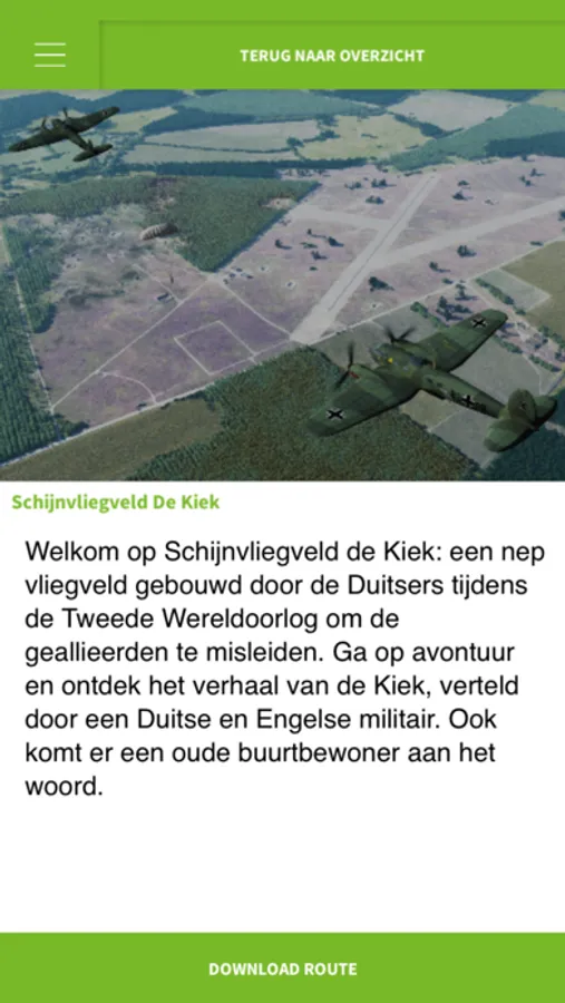 Ontdek de bijzondere verhalen die zich op en rond het Schijnvliegveld De Kiek hebben afgespeeld. De verhalen zijn bewaard gebleven. In deze app kun je verschillende verhalen opnieuw beleven. Zo vertellen een Duitse soldaat en een Britse soldaat vanuit hun persectief het verhaal van het Schijnvliegveld. Een buurtbewoner legt uit wat voor impact het Schijnvliegveld had voor de buurt. wordt via unieke beelden en animaties inzicht gegeven in hoe het Schijnvliegveld er uit heeft gezien. Op deze manier krijg je een goed beeld wat zich allemaal in het verleden heeft afgespeeld. Je krijgt even het idee alsof je zelf in het verleden bent beland.