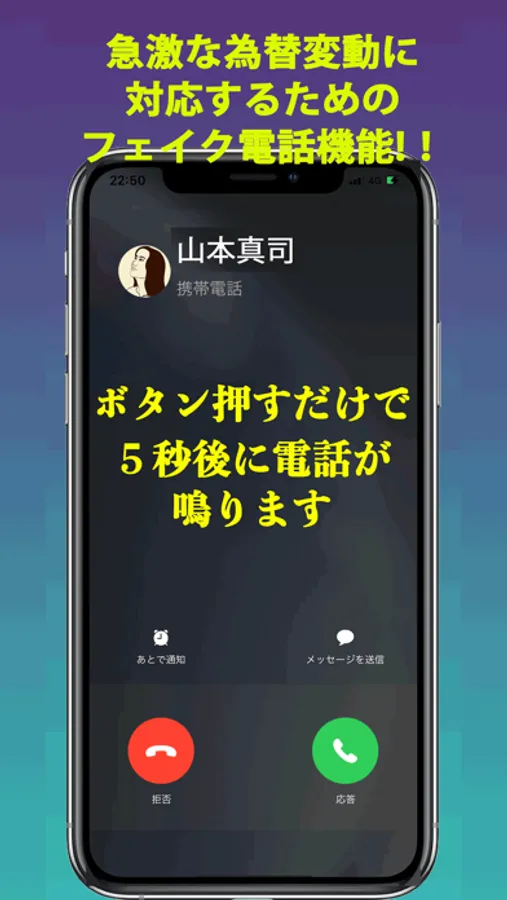 ◉急激な為替変動で仕事・会議中に離席するために、フェイク電話機能があります。