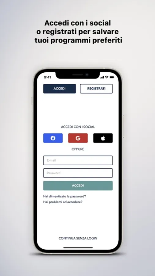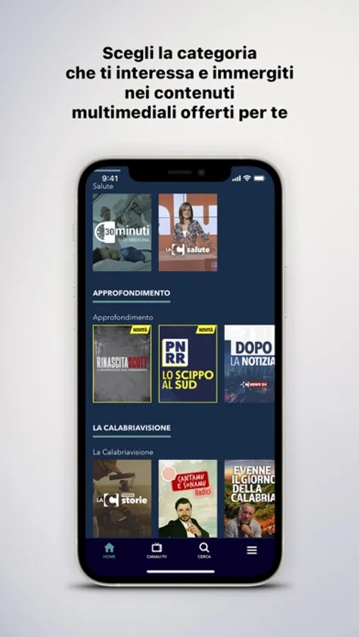 Facendo tap sul menù in basso a destra puoi selezionare le categorie e accedere al programma che ti interessa, navigare tra le altre App della Società Editoriale Diemmecom, registrarti o accedere direttamente tramite il tuo account social per salvare le tue puntate preferite.