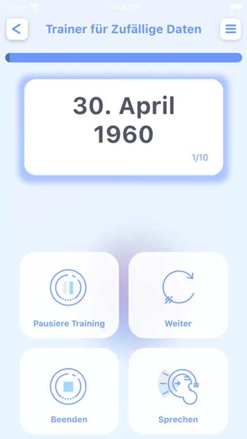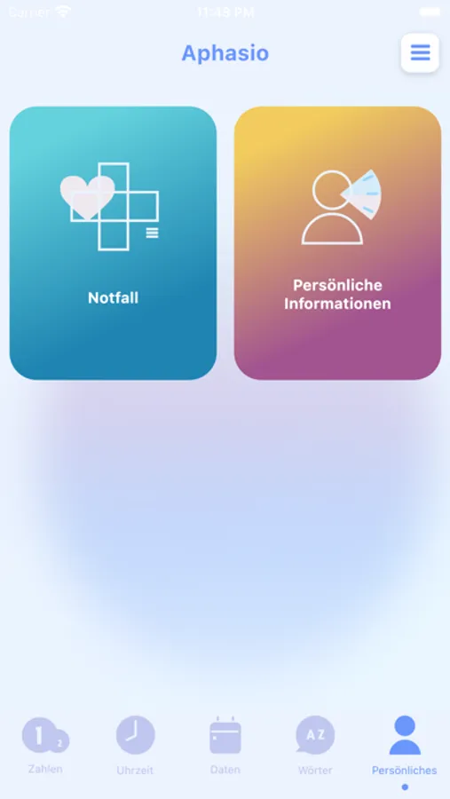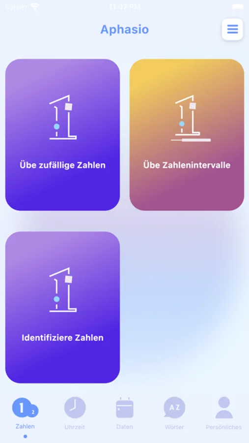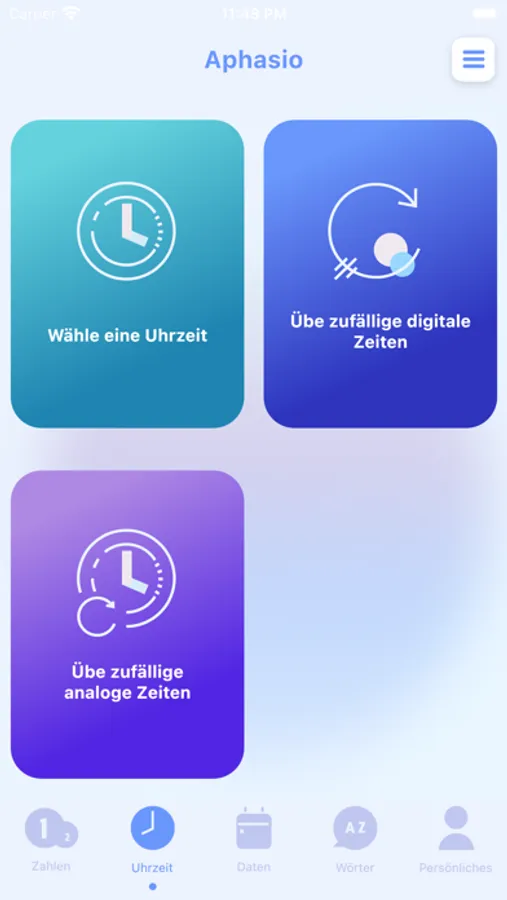 The app allows aphasia patients to learn arbitrary or random dates, times and words as well as to incorporate their own meaningful words into a learning cycle. Thanks to the intuitive operation and user-oriented design, learning is easy and enables the patient to practice alone without a therapist.