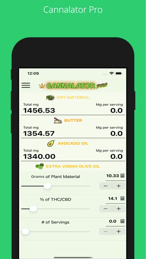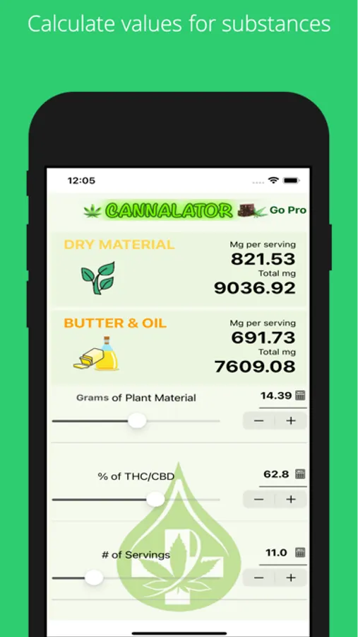 Stop guessing and upgrade to Cannalator Pro! There are options available to help you even more. Cannalator Pro comes with a decarboxylation converter and six different cooking elements. Each element with its infusion percentage is displayed for you to compare.
