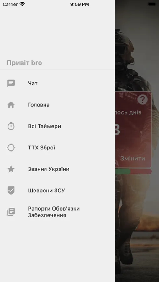 Цей додаток 100% Український з відкритим кодом, не використовує персональні дані, чи місцезнаходження, містить ДМБ таймер, довідник тактико-технічних характеристик з найрозповсюднійшої зброї армії, вбудований воєнторг, чат, приклади рапортів, довідник військових звань з фото, довідник обов`язків військовослужбовця, довідник забезпечення військового.