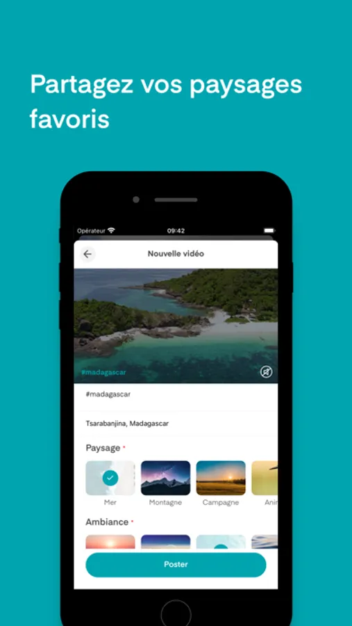 Vous revenez d'un voyage extraordinaire ? Votre galerie est remplie de vidéos de paysages ? Utilisez le bouton «+» pour partager votre aventure avec les autres utilisateurs ! Vérifiez bien que votre vidéo respecte nos règles affichées. Une fois postée, retrouvez votre vidéo sur votre profil en cliquant sur l'icône en haut à droite de votre écran.