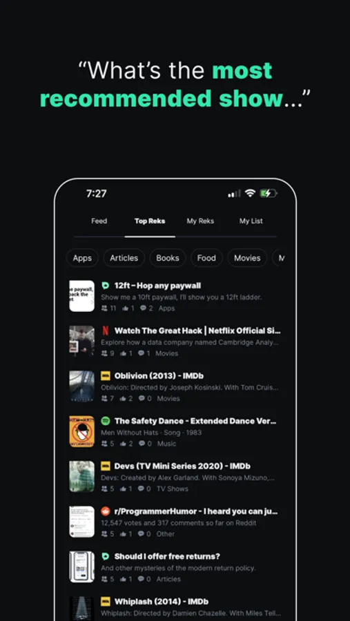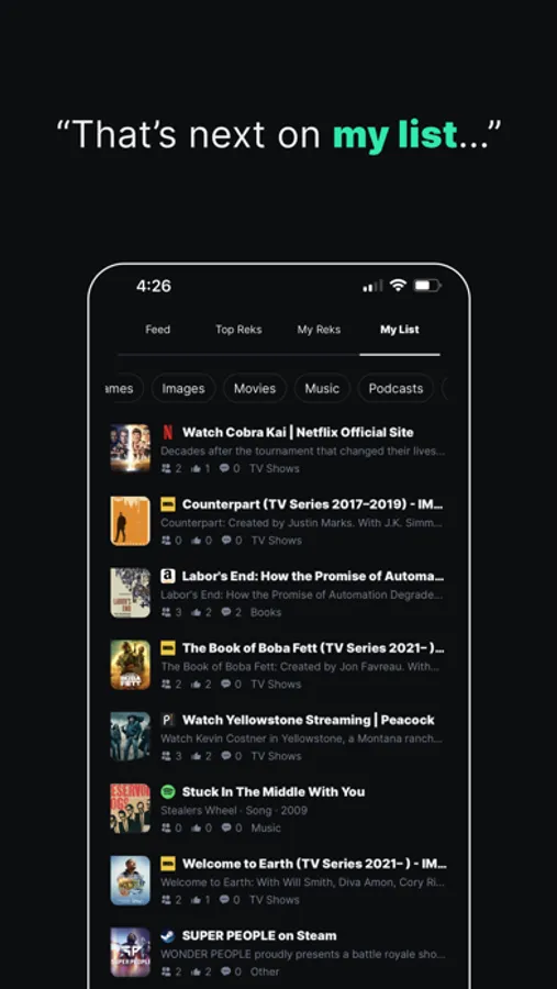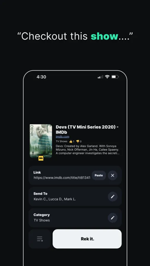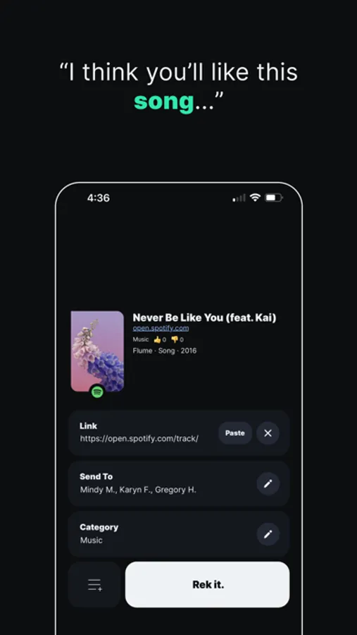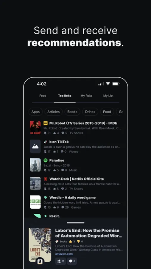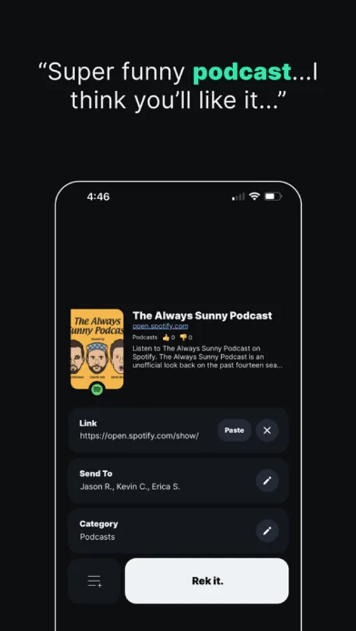 Our friends often recommend great stuff, so why not have an app to keep track of it all? TV shows, movies, books, songs, podcasts, articles, anything that has a link can be a rek.