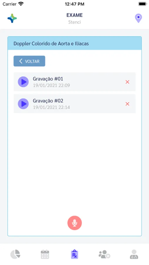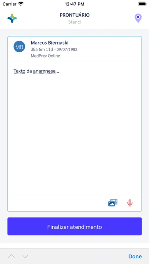 - Prontuário com todo o histórico do paciente, além de dispor de recursos para criar uma nova evolução por voz ou texto.